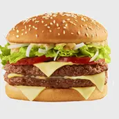 دوبل كبير لذيذ. إنها ليست قطعة واحدة فحسب، بل قطعتين لحم بقرى لذيذ بين شرائح جبنة إيمنتال، مغطاة بشرائح طماطم، خس مبشور، بصل وصوص بيج تايستي الخاص.