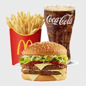 دوبل كبير لذيذ. إنها ليست قطعة واحدة فحسب، بل قطعتين لحم بقرى لذيذ بين شرائح جبنة إيمنتال، مغطاة بشرائح طماطم، خس مبشور، بصل وصوص بيج تايستي الخاص.